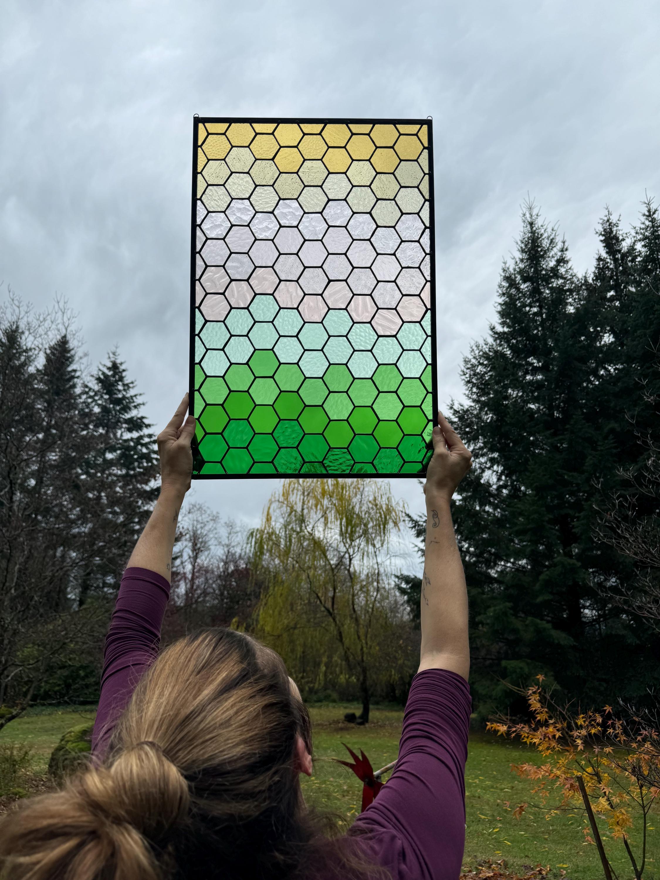 All my panels are fully customizable in every way, please message me with specific details- size, colors, hexagon size, pattern orientation, cabinet insert vs hanging panel, etc.